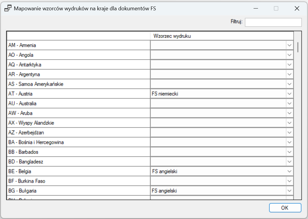 Po wybraniu typu dokumentu, np. FS, wyświetlona zostanie tabela Mapowanie wzorców wydruków na kraje dla dokumentów FS.