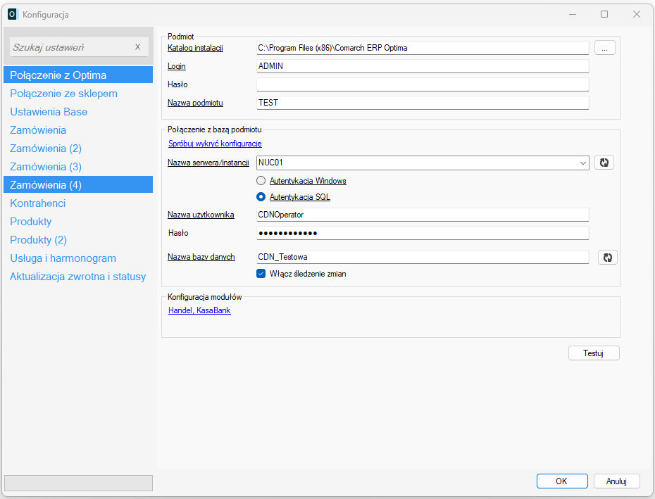 Po uzupełnieniu wszystkich wymaganych pól należy kliknąć przycisk Testuj. Spowoduje to sprawdzenie poprawności połączenia.