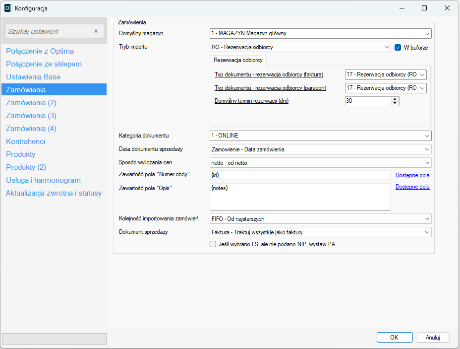 Tryb importu – określa typ dokumentu, do którego będą importowane zamówienia. Dostępne opcje to: PF - proforma, RO - rezerwacja odbiorcy, WZ - wydanie zewnętrzne i DS - dokument sprzedaży (faktura lub paragon).