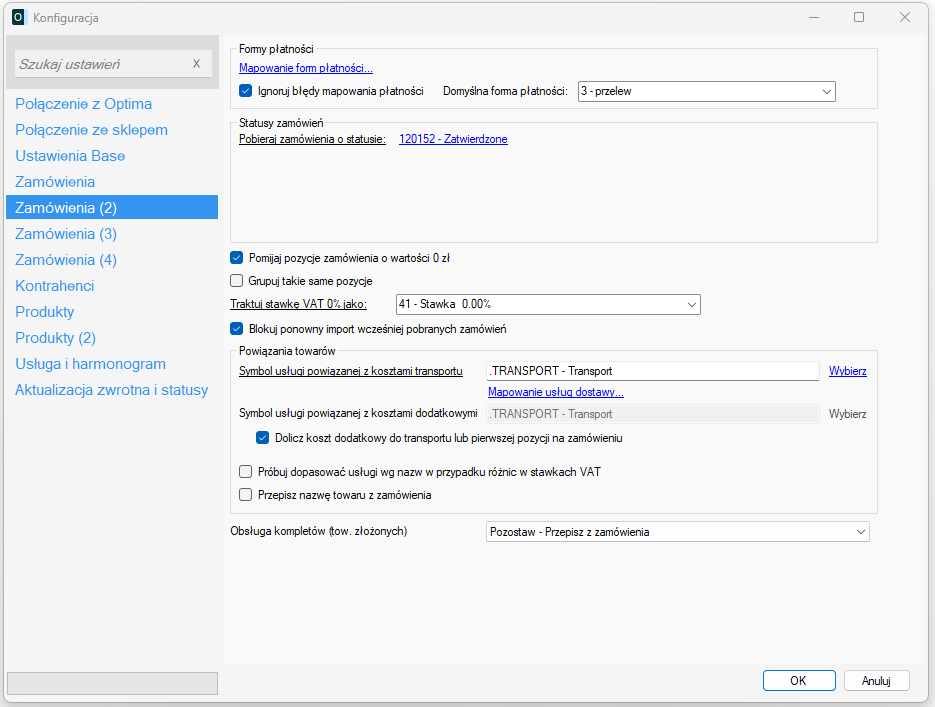 Dla przykładu, jeśli wskazano jako usługę transportową usługę o nazwie "Wysyłka InPost" z domyślną stawką sprzedaży 23%, a stawka na zamówieniu wynosi 8%, integrator spróbuje odszukać inną usługę o dokładnie takiej samej nazwie, ale z innym kodem i stawką VAT z zamówienia (8%). Pozwala to na uniknięcie problemów przy fiskalizacji.