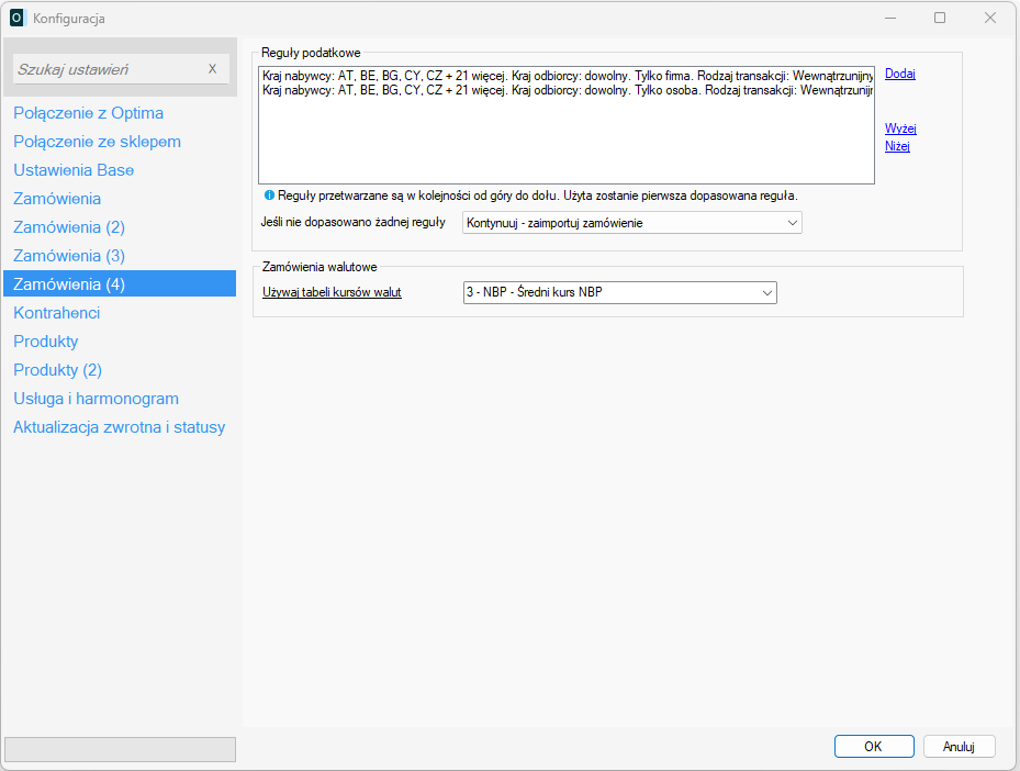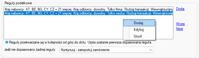 Reguły podatkowe są sprawdzane od góry do dołu listy. Zastosowana zostaje pierwsza pasująca reguła.
