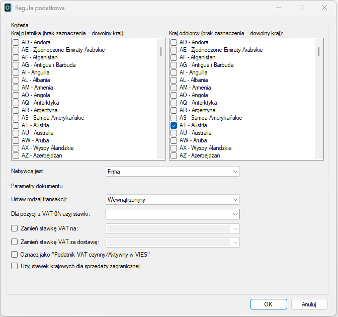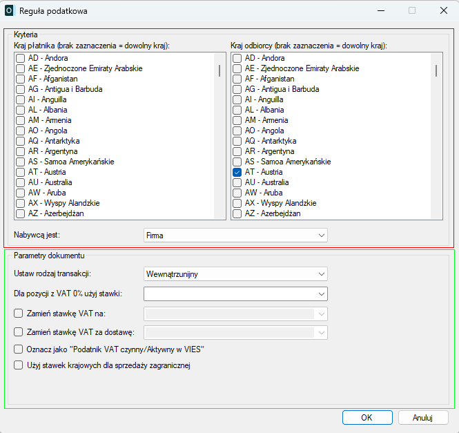 Kraj płatnika i Kraj odbiorcy – pozwalają zawęzić działanie reguły do wybranych krajów. Brak zaznaczonych krajów oznacza, że reguła ma zastosowanie do wszystkich krajów.