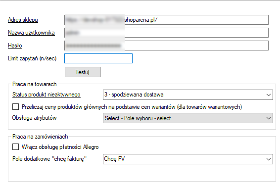 Limit zapytań (n/sec) - pozwala zmniejszyć ilość zapytań na sekundę. Maksymalna wartość na jakiej możemy operować to 10. W przypadku błędów sklepu, należy zmniejszać limit zapytań do odpowiedniej wartości, przy której błędy nie będą się pojawiać.