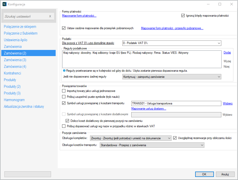 Dla przykładu, jeśli wskazano jako usługę transportową usługę o nazwie „Wysyłka InPost” z domyślną stawką sprzedaży 23%, a stawka na zamówieniu wynosi 8%, integrator spróbuje odszukać inną usługę o dokładnie takiej samej nazwie, ale z innym kodem i stawką VAT z zamówienia (8%). Pozwala to na uniknięcie problemów przy fiskalizacji.