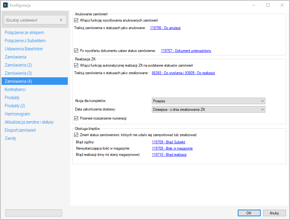 Włącz funkcję wycofywania anulowanych zamówień - aktywuje wskazany mechanizm. Po włączeniu tej opcji należy wskazać statusy zamówień (Traktuj zamówienia o statusach jako anulowane) które określają zamówienia anulowane (np. zwrócone przez kupującego).