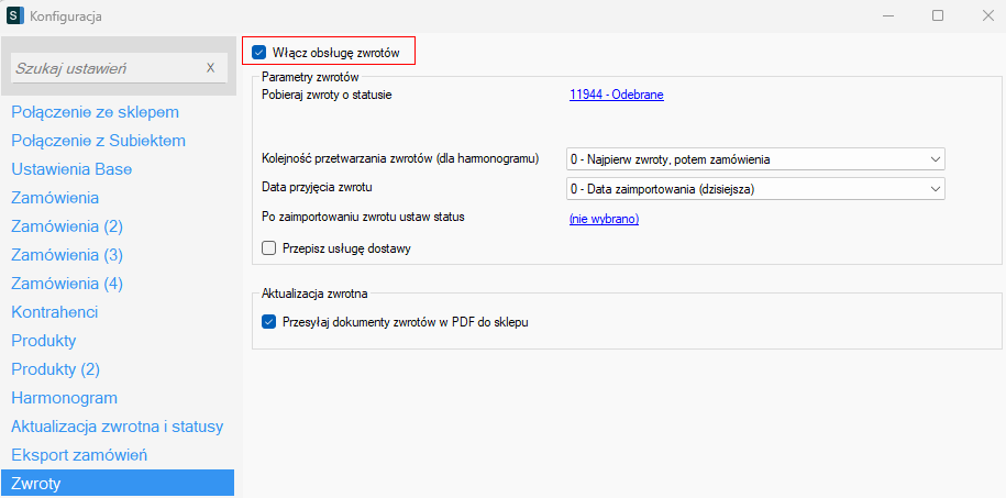 Włącz obsługę zwrotów - aktywuje mechanizm umożliwiający pracę ze zwrotami. Więcej informacji na temat obsługi zwrotów znajduje się w tym artykule pomocy.