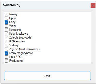 Zapamiętaj i nie pytaj ponownie – spowoduje, że okno Synchronizuj zapamięta określone parametry jako domyślne i nie pokaże się w przyszłości, a program natychmiast przejdzie do wysyłki informacji o towarach (bez konieczności kliknięcia przycisku Start). Ustawienie to można zmienić z poziomu konfiguracji.