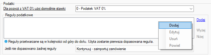 Program > Konfiguracja (F9) > Zamówienia (2) > Podatki > Reguły podatkowe