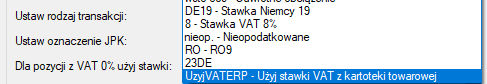 • Zamień stawkę VAT na > UzyjVATERP - Użyj stawki VAT z kartoteki towarowej