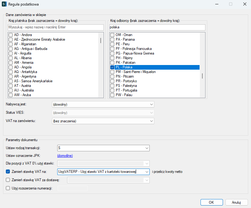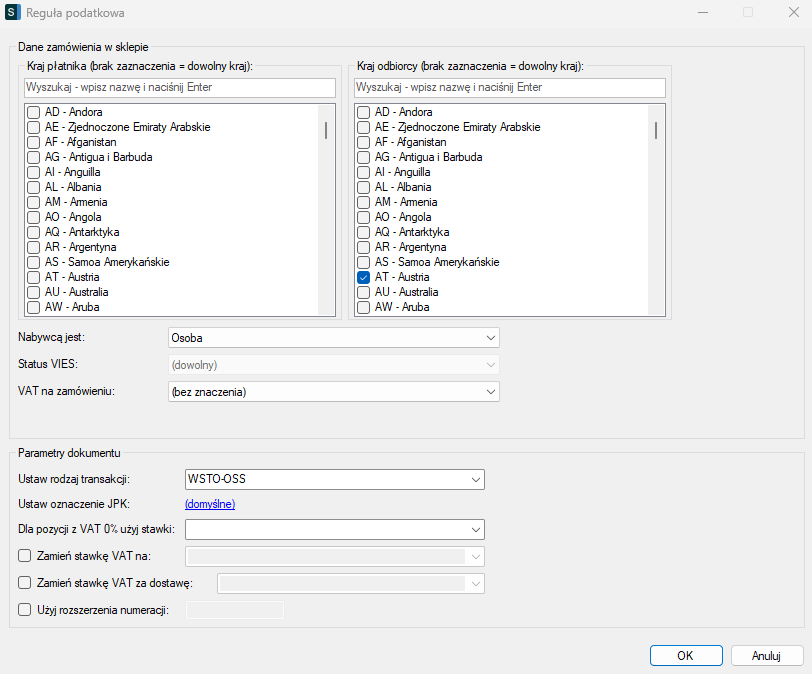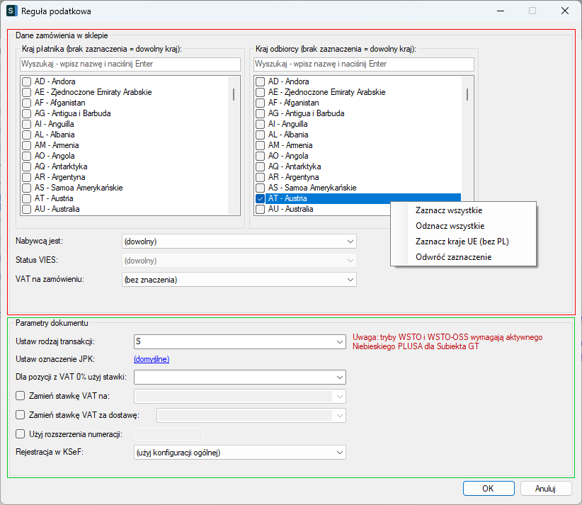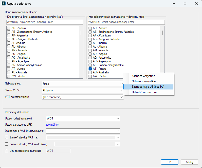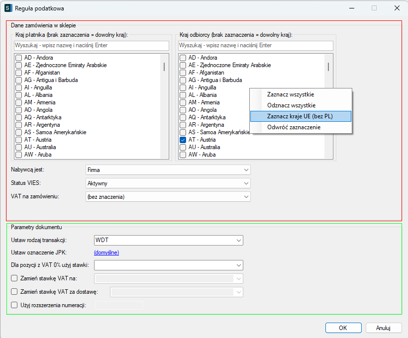 Kraj płatnika i kraj odbiorcy - Pozwalają zawęzić działanie reguły do wybranych krajów. Brak zaznaczonych krajów oznacza, że reguła ma zastosowanie do wszystkich krajów.
