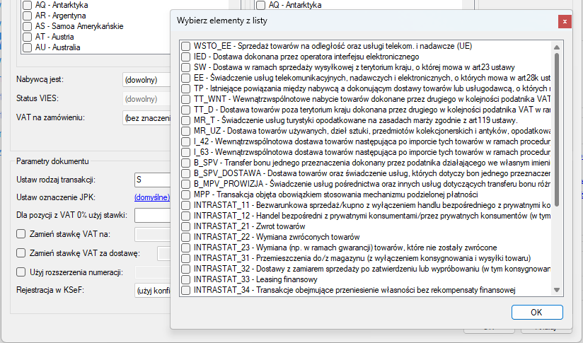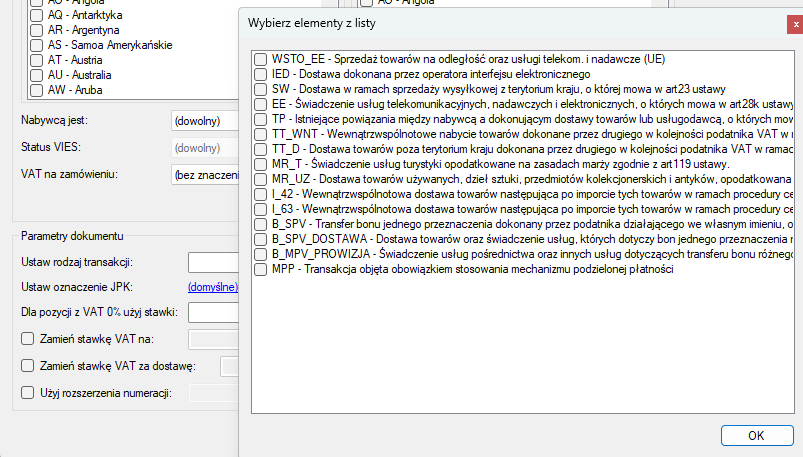 Ustaw rodzaj transakcji - ustawia na dokumencie określony tryb transakcji VAT. Wybierz odpowiednią wartość z listy.