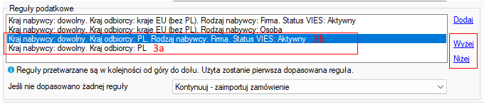 Reguły podatkowe są sprawdzane od góry do dołu listy. Dla jednego zamówienia stosowana jest pierwsza pasująca reguła, a kolejne nie są już analizowane. Jeżeli zamówienie spełnia warunki kilku reguł, zastosowana zostanie ta, która znajduje się wyżej na liście. Dlatego reguły z bardziej szczegółowymi warunkami powinny znajdować się nad regułami ogólnymi.