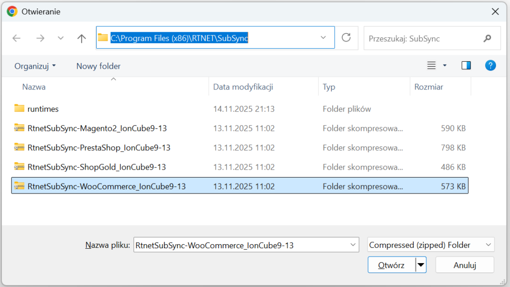 RtnetSubSync-WooCommerce-IonCube9-13.zip. Plik znajduje się w folderze instalacyjnym integratora. Domyślne lokalizacje instalacji to: