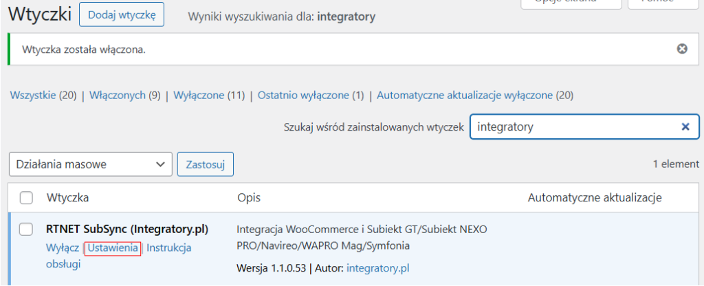 - Powinien pojawić się komunikat „Wtyczka została włączona”. Wyszukaj wtyczkę RTNET SubSync (Integratory.pl) i przejdź w Ustawienia.