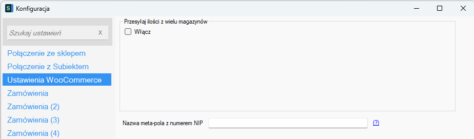 Program > Konfiguracja (F9) > Ustawienia WooCommerce > Nazwa meta-pola z numerem NIP