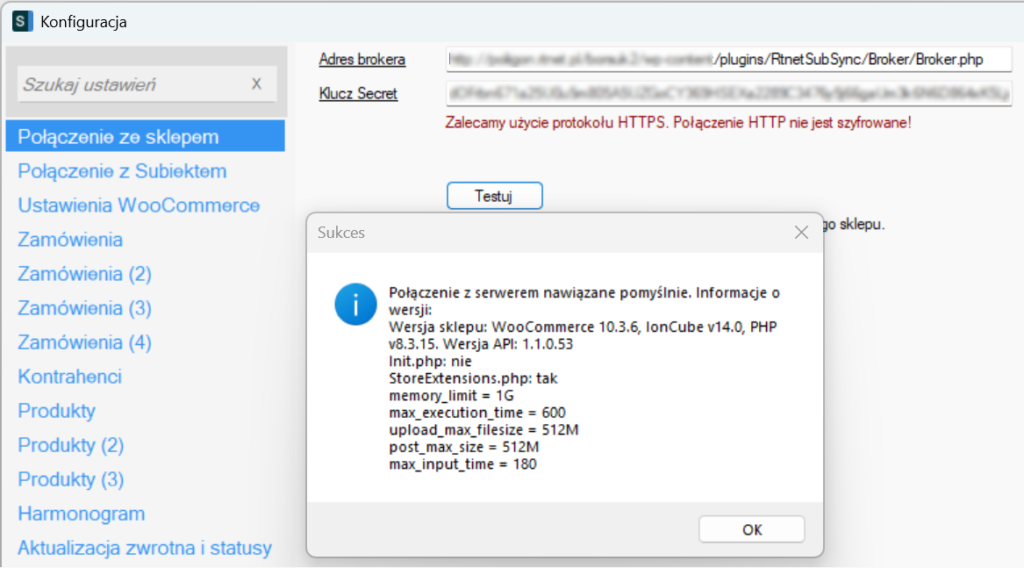 - Wróć do okna konfiguracji integratora. Powinien być widoczny komunikat potwierdzający poprawne połączenie, a pola Adres brokera i Klucz Secret powinny uzupełnić się automatycznie.