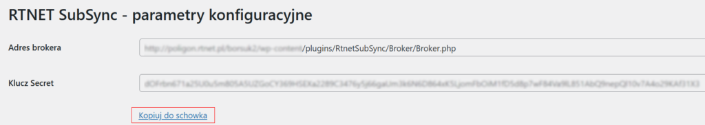 Jeśli użycie opcji „Kopiuj do schowka” nie uzupełniło pól w integratorze, przyczyną może być praca przez pulpit zdalny (problem ze schowkiem) lub wcześniejsze uzupełnienie pól w integratorze. W takiej sytuacji należy skopiować Adres brokera i Klucz Secret osobno z poziomu wtyczki i wkleić je do integratora.