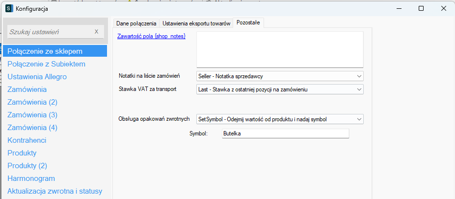 Obsługa opakowań zwrotnych - określa zachowanie integratora dla opakowań zwrotnych i kaucji, które mogą znajdować się na zamówieniu: