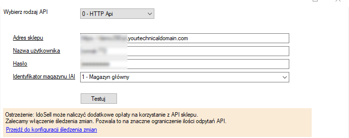 zwróć uwagę na adres sklepu - powinien on prowadzić bezpośrednio do strony np.: https://supersklep.yourtechnicaldomain.com/ . Adres https://supersklep.yourtechnicaldomain.com/panel/main.php jest niepoprawny - Wybierz Identyfikator magazynu IAI - będzie to magazyn IAI do którego integrator wyśle stan magazynowy.
