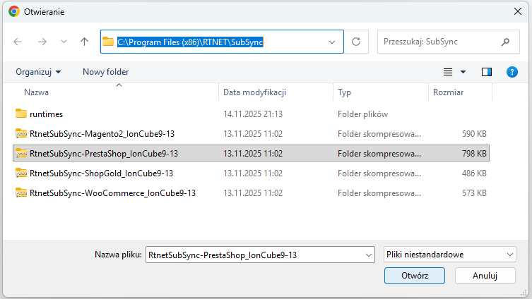 RtnetSubSync-PrestaShop-IonCube9-13.zip. Plik znajduje się w folderze instalacyjnym integratora. Domyślne lokalizacje instalacji to:
