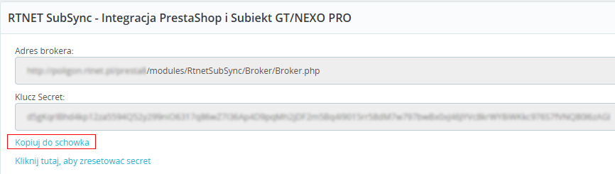 - Zostanie wyświetlona strona konfiguracji modułu RTNET SubSync (Integratory.pl). Kliknij Kopiuj do schowka, aby przenieść Adres brokera i Klucz Secret do konfiguracji integratora.