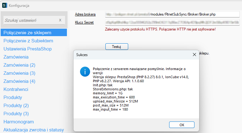 - Wróć do okna konfiguracji integratora. Powinien być widoczny komunikat potwierdzający poprawne połączenie, a pola Adres brokera i Klucz Secret powinny uzupełnić się automatycznie.