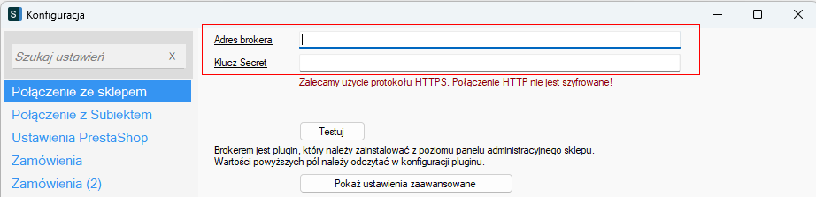 - Przejdź do zakładki Połączenie ze sklepem. Pola Adres brokera i Klucz Secret zostaną uzupełnione po zainstalowaniu modułu brokera i skopiowaniu danych z jej konfiguracji.