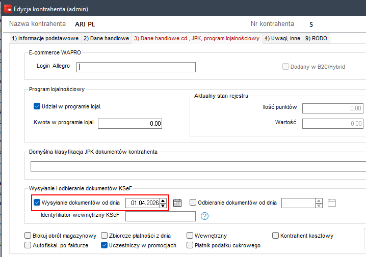 Na podstawie tego ustawienia integrator może wpływać na znacznik Wysyłanie dokumentów do KSeF w kartotece kontrahenta w WAPRO w zakładce 3) Dane Handlowe cd., JPK, program lojalnościowy