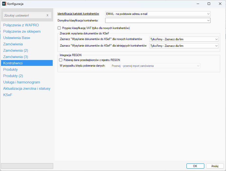 Przypisz klasyfikację VAT (tylko dla nowych kontrahentów) – przypisuje klasyfikację VAT (pole Podlega ewidencji) dla nowo zakładanych kartotek kontrahentów w WAPRO. Jeśli klient jest firmą, pole Podlega ewidencji przyjmie wartość NIP. W przeciwnym wypadku zostanie użyta wartość PESEL/EORI.