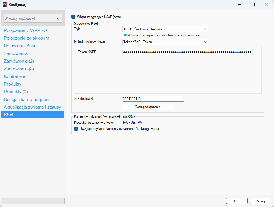 Włącz integrację z KSeF (beta) - aktywuje mechanizm testowy (beta) generowania i wysyłki e-faktur do KSeF.